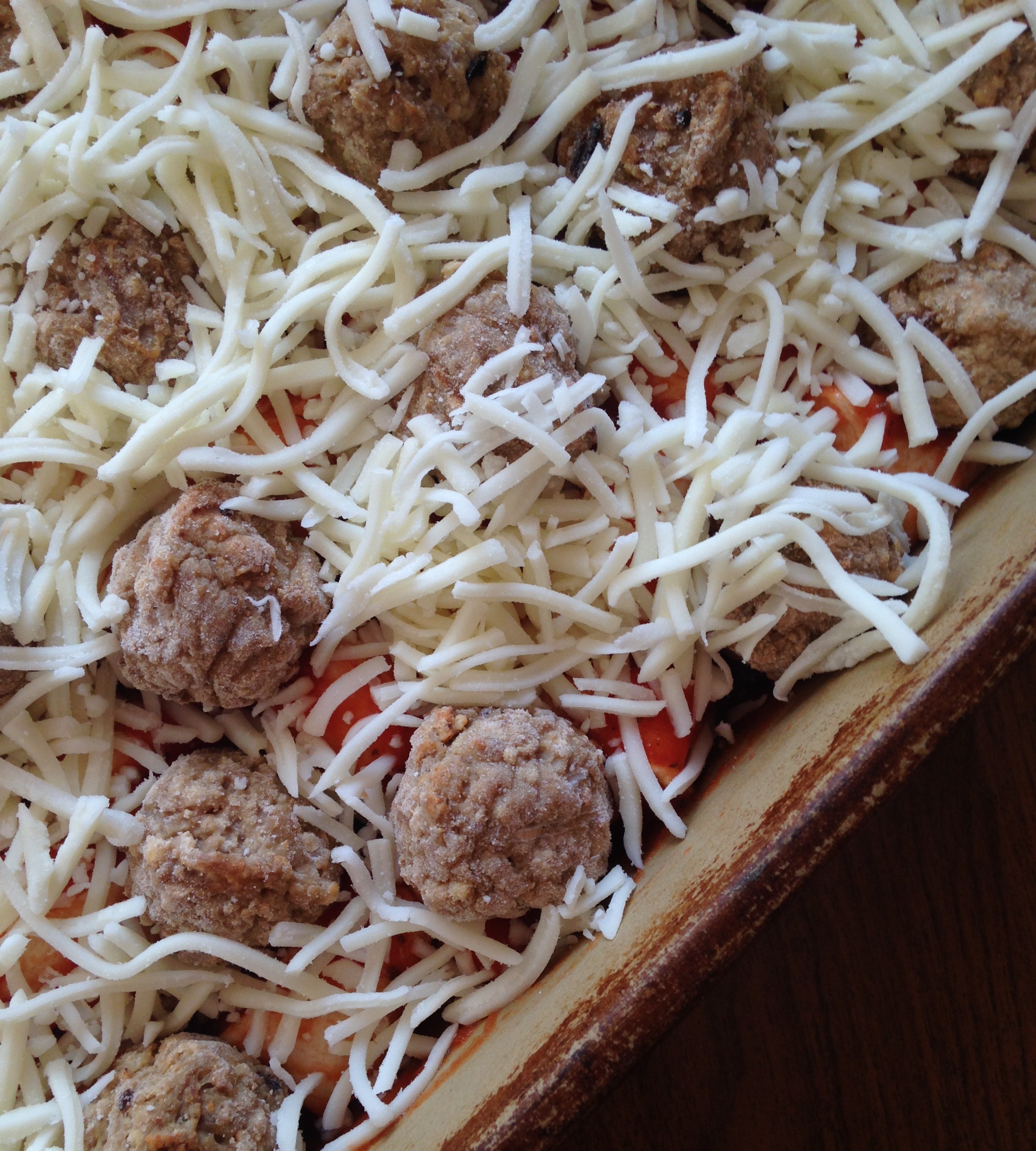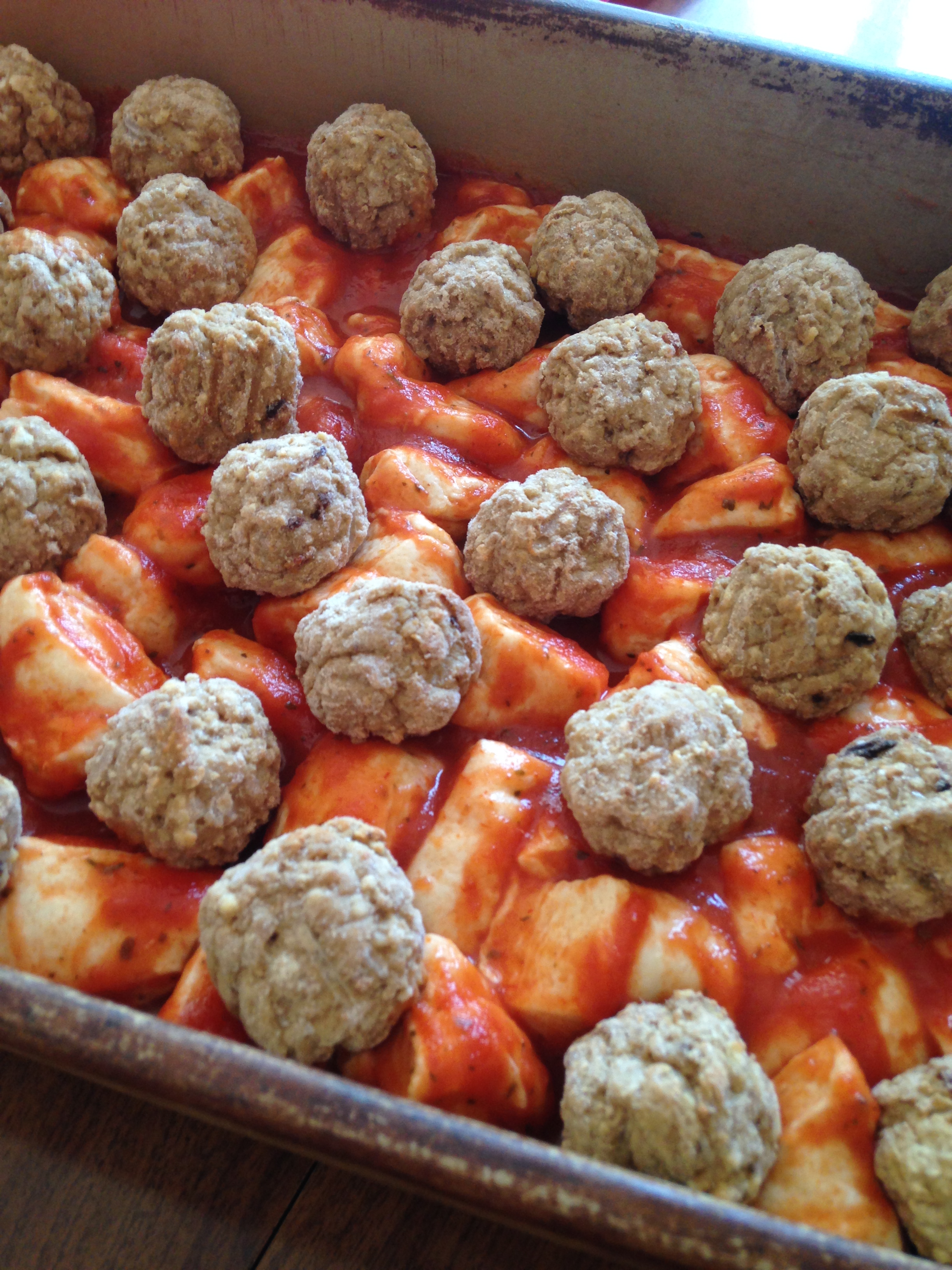 After you combine the biscuits with the sauce, you have a pretty thin and seemingly sparse bottom layer. Don’t worry, though. I took the frozen meatballs and kinda filled in the gaps and added some extra ones here and there. You can certainly make your own meatballs, but I am always shooting for fast and easy. Of course…the more meatballs, the merrier!