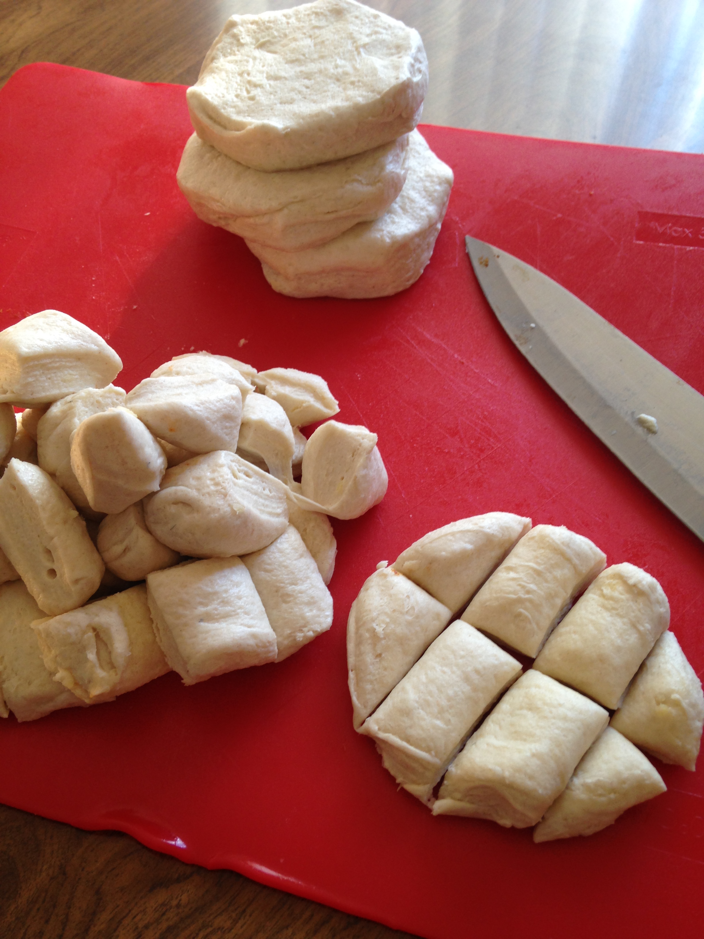 - Open can of biscuits and cut each biscuit into 8 pieces.