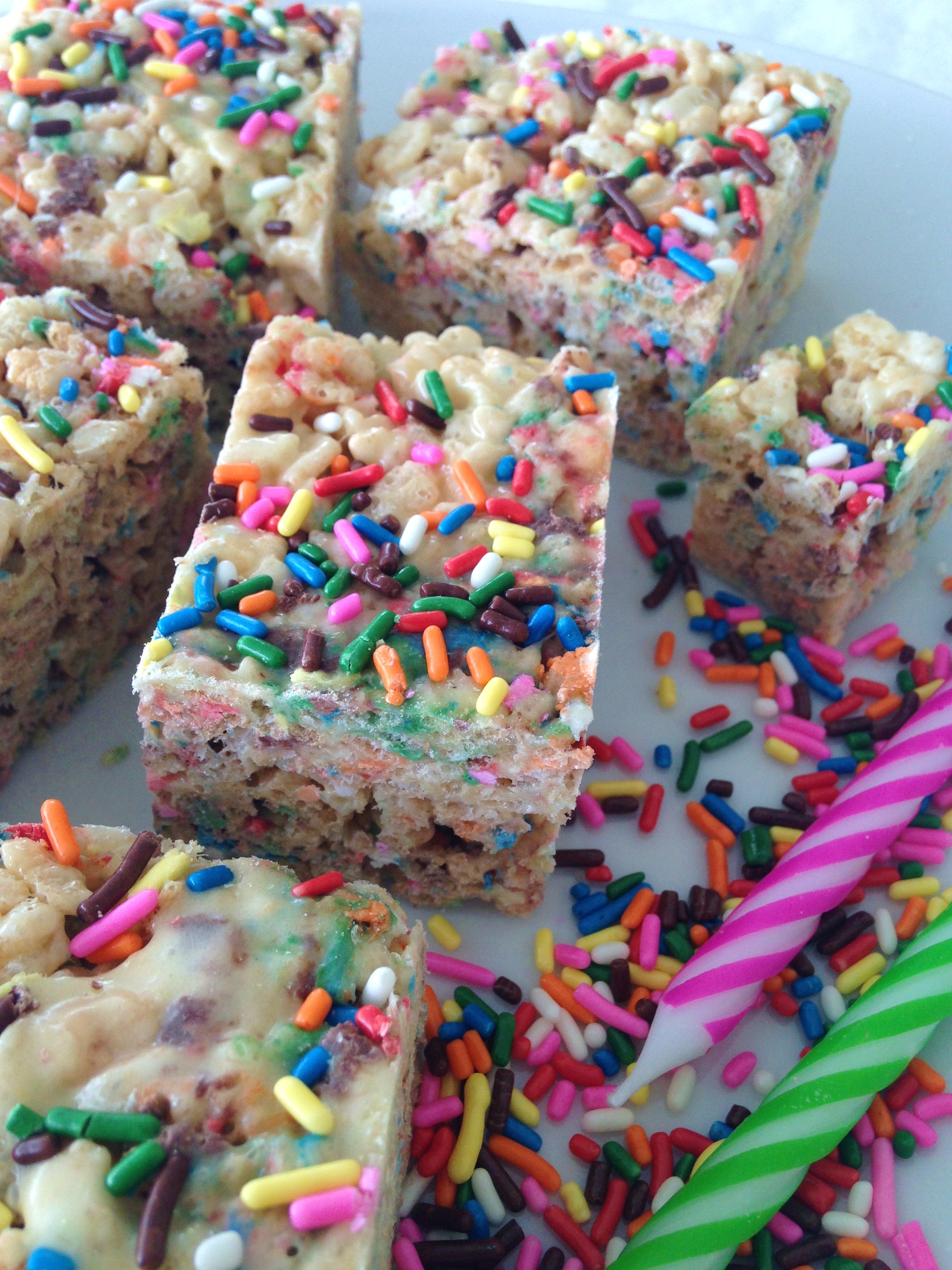 Sprinkles make me SO happy! This recipe makes me happy too! Easiest birthday treats ever! Cake mix + Rice Krispie Treats + SPRINKLES!