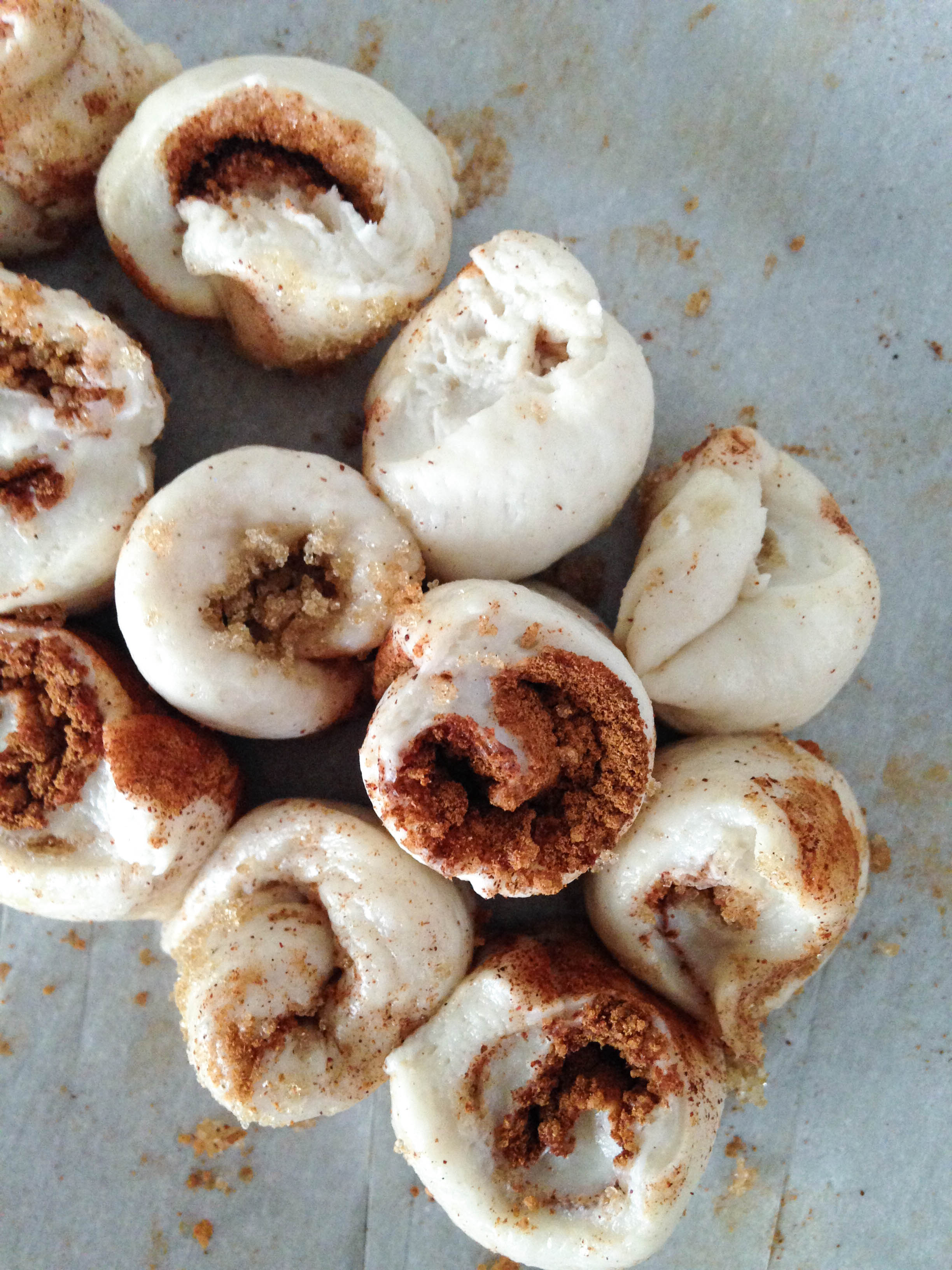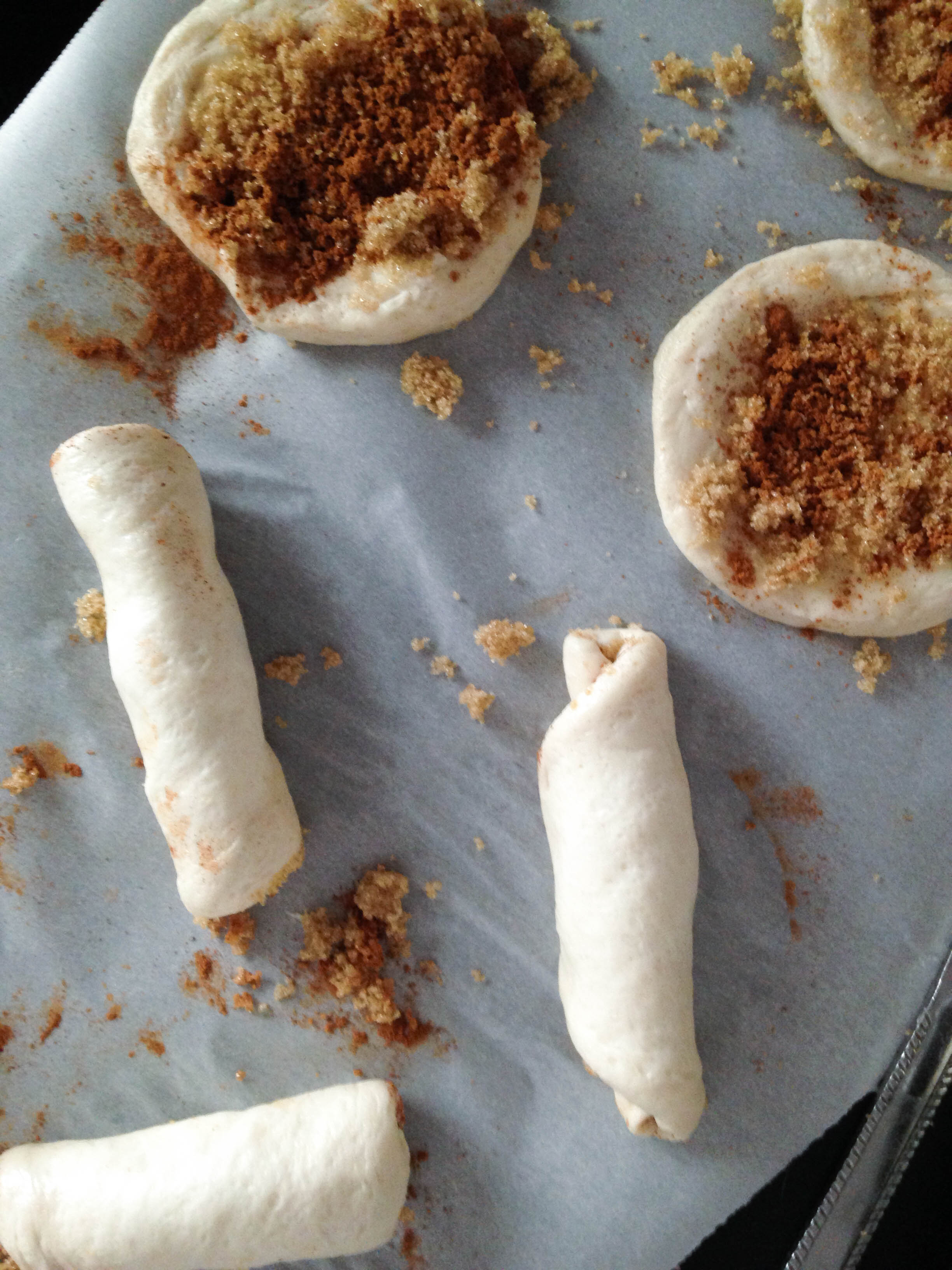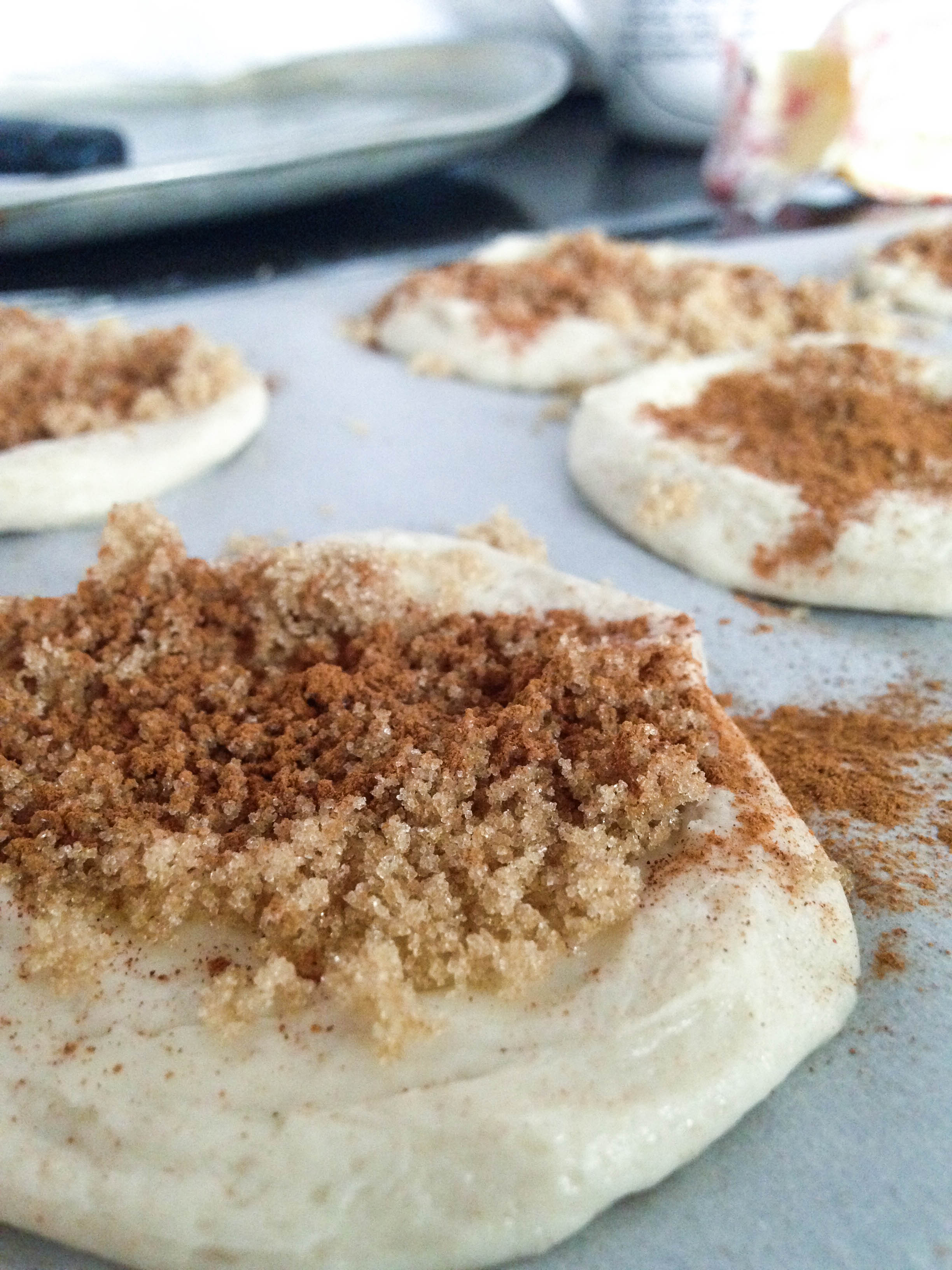 Take each buttered little bun (hehe…I promise I’ll stop) and add your cinnamon and brown sugar.