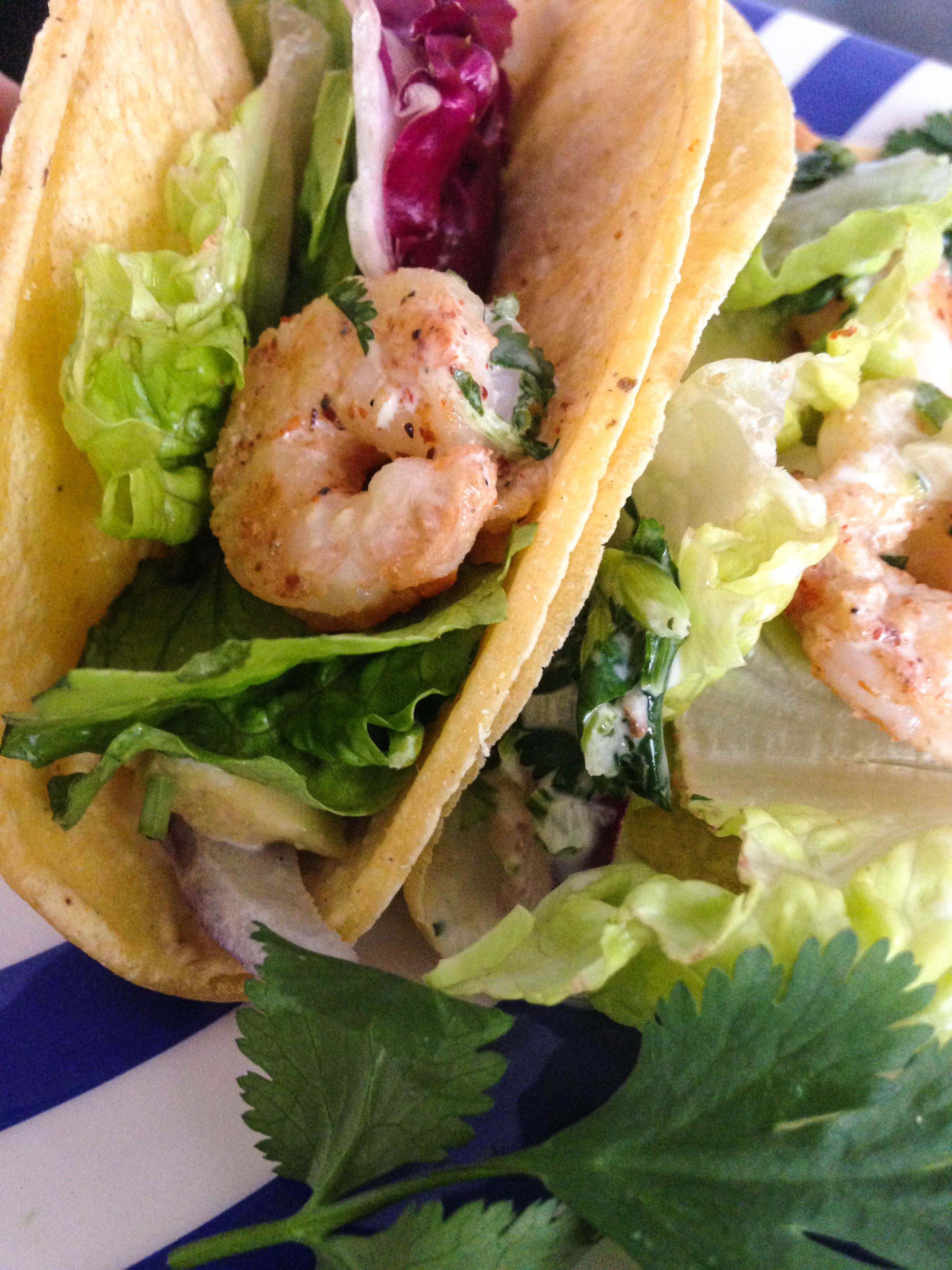 - Assemble your tacos by adding 2 or 3 shrimp to each taco and loading it with lettuce and avocado and topping it off with the cilantro lime sauce.